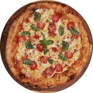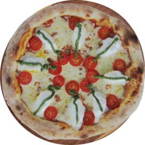 Tamanho único: Aprox. 35cm - 8 PedaçosMolho de tomates frescos, mozzarella, tomatinho holandês, parmesão, folhas de manjericão.