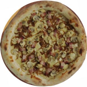 Tamanho único: Aprox. 35cm - 8 PedaçosMolho de queijo, mozzarella, cogumelo paris, cebola caramelizada, bacon.