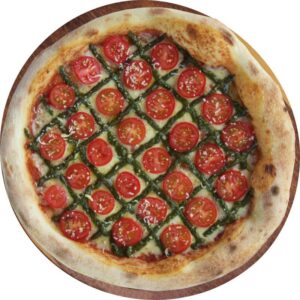 Tamanho único: Aprox. 35cm - 8 PedaçosMolho de tomates frescos, mozzarella, molho pesto de manjericão, tomatinho holandês.