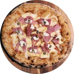Tamanho único: Aprox. 35cm - 8 PedaçosMolho de tomates frescos, mozzarella, finas fatias de presunto Parma, molho de mostarda, alcaparras e parmesão.