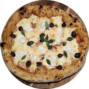 Tamanho único: Aprox. 35cm - 8 PedaçosMolho de tomates frescos, mozzarella de búfala, azeitonas pretas, folhas de manjericão.