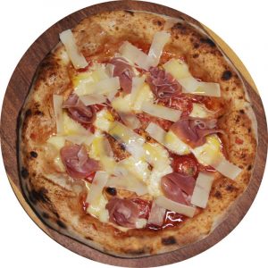 Tamanho único: Aprox. 35cm - 8 PedaçosMolho de tomates frescos, mozzarella, tomatinho holandês, finas fatias de presunto parma, lascas de queijo Grano Padano.