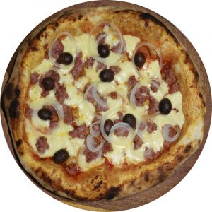 Molho de tomates frescos, mozzarella, linguiça calabresa artesanal, azeitona preta, cebola.